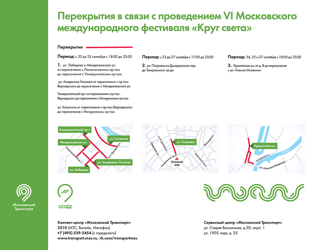 Несколько улиц в центре перекроют на время фестиваля «Круг света».Тщательнее планировать маршрут водителям следует в вечерние часы с 23 по 27 сентября.Движение по нескольким улицам в центре ограничат в связи с проведением VI Московского международного фестиваля «Круг света». Кликабельно! Ежедневно с 23 по 27 сентября с 17:00 до 23:00 для автомобилистов закроют улицу Петровку от Дмитровского переулка до Театрального проезда. С 23 по 25 сентября с 18:00 до 23:00 будет перекрыт ряд улиц в районе МГУ. Нельзя будет проехать по улицам Лебедева и Менделеевской на участке от Ломоносовского до Университетского проспекта. Улицу Академика Хохлова перекроют от пересечения с проспектом Вернадского до Менделеевской улицы. В то же время ограничат движение по Университетскому проспекту и улице Косыгина на участке от проспекта Вернадского до Мичуринского проспекта. 24, 25 и 27 сентября с 18:00 до 23:00 полностью закроют участок Крылатской улицы от дома 8 до пересечения с улицей Нижние Мнёвники. Кроме того, сохранятся ограничения движения в связи со строительством станций метрополитена, реконструкцией зданий и инженерных сетей. До 28 февраля 2017 года из-за строительства Калининско-Солнцевской линии метро круглосуточно ограничено движение по одной полосе улицы Генерала Ермолова в районе дома 6. А с 24 сентября по 13 ноября транспорт не будут пускать по одной полосе улицы Остоженки (от дома 4 до дома 8). Такие меры необходимы для проведения реконструкции здания. В связи с реконструкцией инженерных сетей с 26 сентября до 14 октября сразу две полосы закроют в районе дома 11 по улице Плющихе. До 30 мая круглосуточно ограничено движение по полосе от дома 2 по Огородному проезду до дома 45 на Шереметьевской улице. Ещё одну полосу до 30 ноября перекрыли на Звёздном бульваре (дом 26, корпус 1) и на Шереметьевской улице (дом 85, строение 2). Из-за работ на инженерных сетях в ЦАО до 25 октября закрыта полоса в Лужнецком проезде в районе дома 2. А с 27 сентября по 25 октября и с 5 по 31 октября нельзя будет проехать по одной полосе улицы Хамовнический Вал в районе пересечения с Лужнецким проездом.