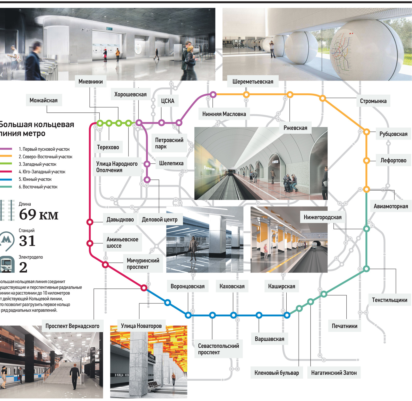 В Москве открыли пять новых станций метро.В Москве произошло долгожданное событие — открыт второй участок Большой кольцевой линии метро. Участок имеет 5 станций — «Петровский парк», «ЦСКА», «Хорошёвская», «Шелепиха» и «Деловой центр». На первоначальном этапе северный сегмент будущей второй кольцевой линии метро будет работать совместно с Солнцевским радиусом. На новой линии организовано вилочное движение поездов по двум маршрутам: «Петровский парк» — «Раменки» и «Петровский парк» — «Деловой центр». Станция «Деловой центр» Солнцевского радиуса, открытая в январе 2014 года, закрыта 24 февраля и возобновит свою работу только после разделения линий.Таким образом, количество станций Московского метрополитена возросло до 212 штук, но одна из станций временно выведена из эксплуатации. Из пяти новых станций четыре имеют пересадки:«Петровский парк» — на станцию «Динамо» Замоскворецкой линии метро. «Хорошёвская» — на станцию «Полежаевская» Таганско-Краснопресненской линии метро. «Шелепиха» — на одноимённую станцию Московского центрального кольца (МЦК). «Деловой центр» — на станцию «Выставочная» Филёвской линии метро, а в перспективе будет иметь пересадку на станцию «Деловой центр» Калининско-Солнцевской линии.  Открытый участок позволит перераспределить поток пассажиров Московского метрополитена и частично разгрузить упомянутые выше линии. Первый участок будущей Большой кольцевой линии Московского метрополитена протяжённостью 3,3 километра от станции «Каширская» до станции «Каховская» был открыт 11 августа 1969 года в составе Горьковско-Замоскворецкой линии метро. После открытия в 1985 году южного участка линии участок «Каширская» — «Каховская» стал её ответвлением, а после строительства оборотного тупика за станцией «Каширская» 20 ноября 1995 года стал самостоятельной Каховской линией.  Если между открытием первого и второго участков БКЛ прошло почти полвека, то теперь новые станции второй кольцевой линии будут открываться ежегодно!