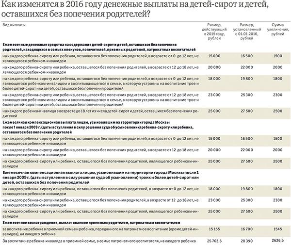 Почти 15 тысячам сирот и детей, оставшихся и без попечения родителей, ежемесячные выплаты в 2016-м Москва повысила на 10%. Их получают семьи опекунов, попечителей, приемных родителей, патронатных воспитателей, а также лица, усыновившие в Москве после 1 января 2009 г. ребенка-сироту или ребенка, оставшегося без попечения родителей. Помощь города в новом размере первый раз будет произведена в феврале.