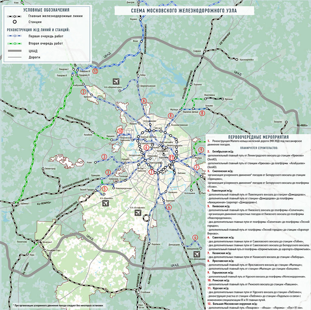 До 2020 года в первую очередь построят дополнительные главные пути на участках длиной около 193 километров. Это позволит повысить транспортную доступность не охваченных метро районов Москвы и крупных подмосковных городов, таких как Мытищи, Пушкино, Королев, Железнодорожный, Одинцово, Подольск.