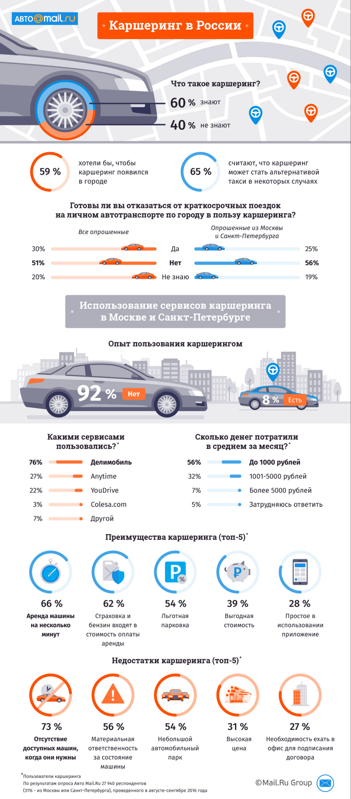 Россияне: альтернативой такси станет аренда автомобилей.В России набирает обороты каршеринг — краткосрочная аренда автомобиля для коротких внутригородских поездок.«Авто Mail.Ru» решил выяснить отношение россиян к этому явлению, опросив около 25 тысяч жителей городов-миллионников. Как оказалось, две трети респондентов верят, что потенциально каршеринг может стать альтернативой такси. При этом более половины автолюбителей не готовы променять личное авто на арендованное. Кстати, что такое каршеринг, знают более половины (60%) опрошенных. Москвичи и петербуржцы информированы гораздо лучше, чем жители других городов: в столицах об этом явлении осведомлены 72%, а в других городах-миллионниках — всего 28%. 59% респондентов из городов, в которых пока нет каршеринговых сервисов, хотели бы, чтобы они появились. Однако каждый пятый высказался против. 51% автолюбителей не готов променять личное авто на арендованное, даже если ехать совсем недалеко, хотя каждому третьему респонденту (30%) такая идея пришлась по душе. Интересно, что в Москве и Санкт-Петербурге доля тех, кто ни под каким предлогом не откажется от личного автомобиля, выше, чем в других больших городах (56%). Две трети опрошенных (65%) считают, что потенциально каршеринг может стать альтернативой такси, но каждый четвертый не верит в это. Самым популярным сервисом стал «Делимобиль»: среди тех, кто пользуется каршерингом, ему отдали предпочтение 76% респондентов. 27% сделали выбор в пользу Anytime, 22% — YouDrive. Большинство (56%) тех, кто арендовал автомобиль для поездок по городу, тратили на это менее тысячи рублей в месяц, каждому третьему (32%) это обходилось от одной до пяти тысяч рублей. По мнению пользователей каршеринга, основные преимущества услуги — возможность арендовать авто на несколько минут, не думать о расходах на страховку и бензин, а также парковаться по льготному тарифу. В пятерку главных плюсов, кроме того, вошли выгодная стоимость и удобные мобильные приложения. Среди серьезных разочарований — отсутствие доступных автомобилей, когда они необходимы, материальная ответственность арендатора за состояние автомобиля, небольшой автомобильный парк каршеринговых сервисов, высокая стоимость аренды и необходимость ехать в офис арендодателя для подписания договора.
