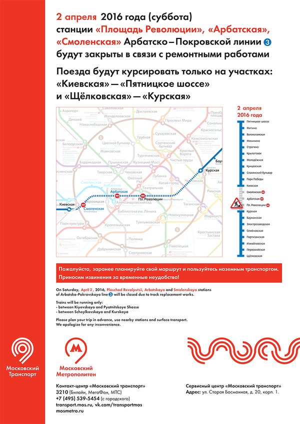 Участок Арбатско-Покровской линии метро в Москве будет закрыт 2 апреля.МОСКВА, 30 мар — РИА Новости. Центральный участок Арбатско-Покровской линии московского метро будет закрыт 2 апреля в связи с капитальным ремонтом пути, сообщает в среду пресс-служба Московского метрополитена.Кликабельно!«В ближайшую субботу, 2 апреля 2016 года, в течение всего дня будет прекращено движение поездов на участке Арбатско-Покровской линии от станции “Курская” до станции “Киевская”. Ограничения в движении вводятся в связи с проведением работ по капитальному ремонту пути. Станции “Смоленская”, “Арбатская” и “Площадь Революции” будут закрыты. В обычном режиме данный участок метрополитена возобновит работу в воскресенье в 5:30 утра», — говорится в сообщении. Также отмечается, что 2 апреля движение поездов на Арбатско-Покровской линии будет осуществляться только на участках от «Щёлковской» до «Курской» и от «Киевской» до «Пятницкого шоссе». Станции «Курская» и «Киевская» будут работать как конечные станции с пересадками на Кольцевую линию. Пересадки между Кольцевой и Арбатско-Покровской линиями будут работать в обычном режиме.