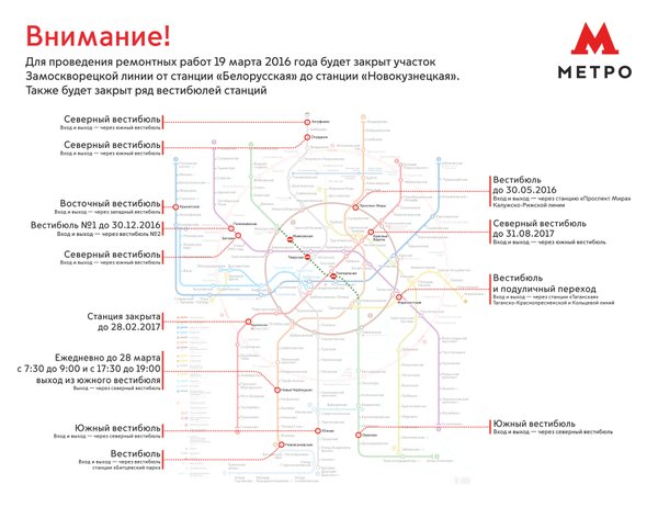 «В рамках программы благоустройства в предстоящие выходные будут закрыты вестибюли несколько станций Московского метрополитена. Для входа в метро и выхода в город пассажиры смогут воспользоваться соседними вестибюлями, расположенными в непосредственной близости от закрытых. С 22:00 пятницы, 18 марта, до открытия метрополитена в понедельник, 21 марта, для пассажиров будут закрыты вестибюль и подуличный переход станции «Марксистская», южный вестибюль станции «Орехово» и северный вестибюль станции «Алтуфьево», — говорится в сообщении.