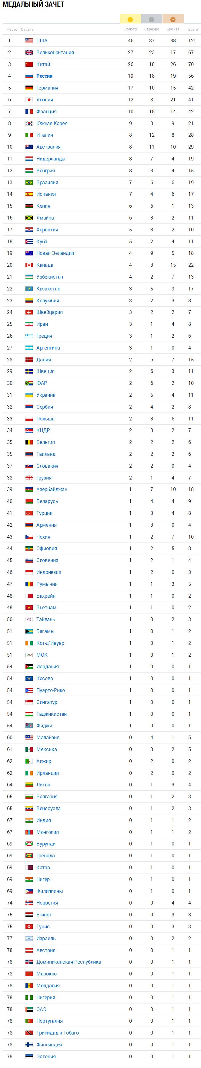 В медальном зачете Россия с 54 наградами (18 золотых, 17 серебряных и 19 бронзовых) занимает четвертое место. Американцы по-прежнему лидируют, у сборной США уже 118 медалей (43 золотые, 37 серебряных и 38 бронзовых). На второй позиции — Великобритания (66 наград, в том числе 27 золотых). На третьем месте — Китай (70 медалей, в том числе 26 золотых).