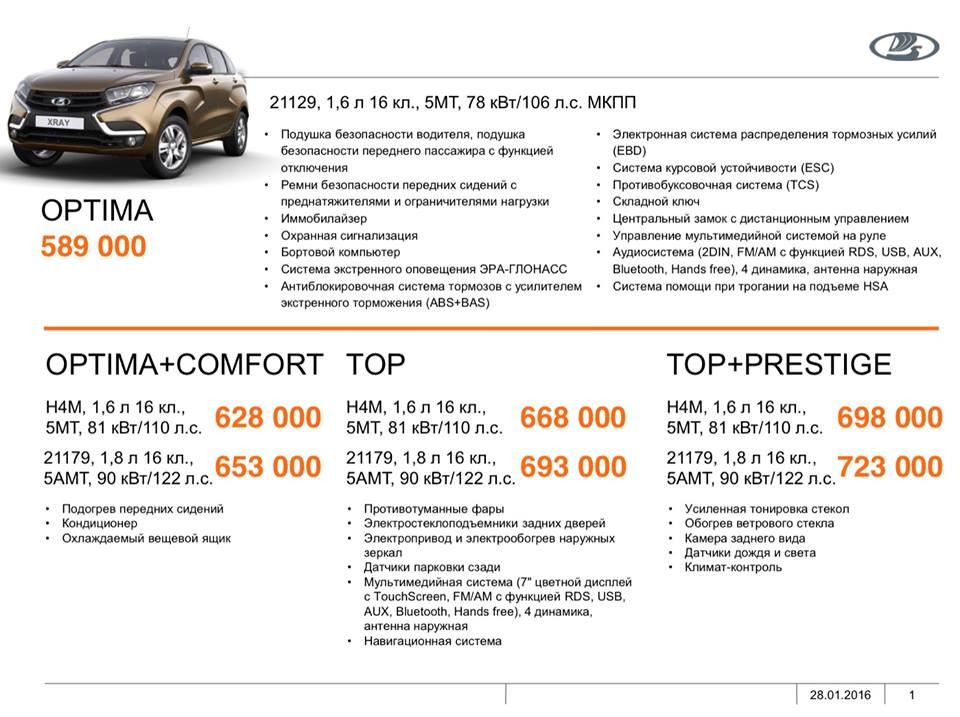 Lada XRAY: АвтоВАЗ неожиданно назвал цены.За две недели до старта продаж российский автогигант раскрыл стоимость нового кроссовера и список оборудования, которым он будет оснащаться. АвтоВАЗ обещал опубликовать прайс-листы на Lada XRAY только 14 февраля, но неожиданно раскрыл стоимость своего первого кроссовера на пару недель раньше: похоже, вазовцы решили, что скрывать очевидное бессмысленно — во время журналистского теста, который сейчас проходит по дорогам Краснодарского края, в окрестностях Сочи, пресса всё равно разведала и содержимое комплектаций и примерные цены. Собственно, цены таковы. Самый дешёвый «Икс-Рей» будет стоить 589 тысяч рублей, а самый дорогой вариант дилеры будут предлагать за 668 тысяч — да, комплектаций будет всего две. Кстати, стоимость новинки оказалась даже ниже ожидаемой — изначально планировалось, что за «высокий хэтчбек», как осторожно называют модель представители автогиганта, будут просить от 600 тысяч. Комплектация Optima («Оптима») — от 589 000 рублей:- подушки безопасности водителя и пассажира - крепления детских сидений ISOFIX - дневные ходовые огни - антиблокировочная система тормозов (ABS) - система стабилизации (ESC) - система распределения тормозных усилий (EBD) - система помощи при трогании на подъеме - противобуксовочная система (TCS) - бортовой компьютер - раскладная спинка заднего дивана - электрогидравлический усилитель рулевого управления - рулевая колонка, регулируемая по высоте - электростеклоподъёмники передних дверей - система ЭРА-ГЛОНАСC - аудиосистема - 16-дюймовые легкосплавные колёсные диски - центральный замок Базовый мотор — вазовский 1,6-литровый шестнадцатиклапанник (106 л.с.). Такой же автомобиль, но оснащённый ниссановским двигателем (1,6 л., 110 л.с.) и дополнительным пакетом оборудования Comfort («Комфорт»), который включает подогрев передних сидений, кондиционер и охлаждаемый перчаточный ящик, будет стоить уже 628 тысяч рублей. А за самую мощную 1,8-литровую 122-сильную версию и роботизированную трансмиссию АМТ предстоит отдать 653 тысячи. Комплектация TOP («ТОП») — от 668 000 рублей:- кондиционер - подогрев передних сидений - электропривод и электрообогрев наружных зеркал - электростеклоподъемники задних дверей - мультимедийная система: с навигацией и 7-дюймовым сенсорным дисплеем - парктроник - противотуманные фары В данном случае покупатель получит машину со 110-сильным 1,6-литровым двигателем и «механикой». Тем, кто захочет получить аналогичный автомобиль, но со 122-сильным 1,8-литровым мотором и АМТ придётся заплатить уже 693 тысячи рублей. Притом для варианта TOP доступен пакет дополнительного оснащения под названием Prestige («Престиж»), включающий камеру заднего вида, обогрев ветрового стекла, климат-контроль, а также датчики дождя и света. С двигателем 1.6 стоимость такого автомобиля, составит 698 тысяч рублей, с двигателем 1.8 — 723 тысячи. Цветов для Lada XRAY предлагается семь: помимо традиционных белого и чёрного, это оранжевый, красный, коричневый, бежевый и платиновый. Кликабельно!КонкурентыСразу отметим, что XRAY — единственная модель своего класса, у которой базовая комплектация включает антизаносную систему (и системы-сателлиты: помощи при трогании и противобуксовочную) и «ЭРУ-ГЛОНАСС». Renault Sandero Stepway — от 630 000 рублей Самый дешёвый Stepway — это машина со слабеньким восьмиклапанником 1.6 (82 л.с.), без ESP и аудиосистемы, но —