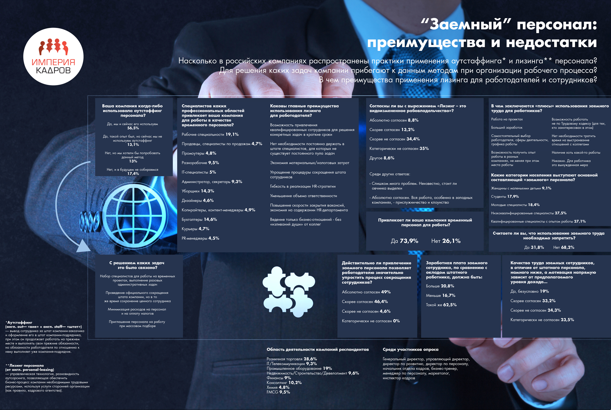 «Заемный» персонал: преимущества и недостатки. Результаты исследования.Насколько в российских компаниях распространены практики применения аутстаффинга и лизинга персонала? Для решения каких задач компании прибегают к данным методам при организации рабочего процесса?В чем преимущества применения лизинга для работодателей и сотрудников? Чтобы разобраться в поставленных вопросах, Исследовательский Центр Холдинга «Империя Кадров» провел глобальных опрос среди экспертов рынка труда. Исследование показало, что 56,5% компаний активно используют практику аутстаффинга, 13,1% - имели такой опыт, 13% - хотели бы применить данный метод и лишь 17,4% - не готовы к ведению бизнеса подобным образом. Возможность привлечения квалифицируемых сотрудников для решения конкретных задач в кратчайшие сроки и отсутствие необходимости постоянно держать в штате специалистов, для которых не существует постоянного пула обязанностей – вот основные аспекты, заставляющие компании практиковать взвешенно подходить к решению текущих задач. Изображение кликабельно!