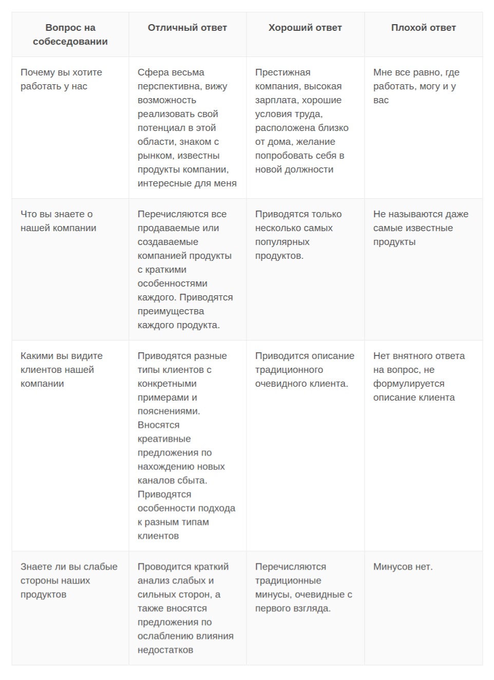Примеры отличных, хороших и плохих ответов на вопросы на собеседовании: