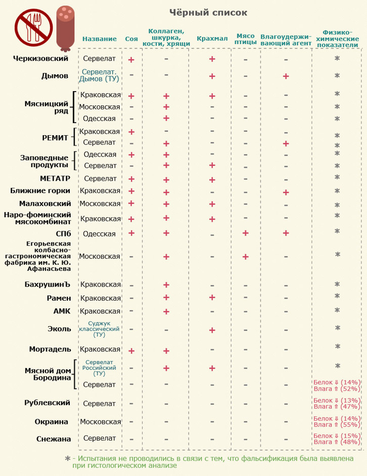 Чрезмерное употребление колбасных изделий, наряду с другими солеными продуктами, ведет к переизбытку натрия в организме, которое в свою очередь является фактором риска артериальной гипертензии (повышенного давления). И это еще не все В черный список за фальсификацию также попали варено-копченые колбасы «Сервелат», производства ООО «Калинка», «Мини-салями», производства ООО «Читинская мясная компания», «Буженинная», производства ООО «Регионэкопродукт-Поволжье» и полукопченые «Украинская» мясной продукт, производства ОА МПК «Максимовский» и «Краковская люкс», ОАО «Великолукский мясокомбинат», выявленные экспертизой Роспотребнадзора. Таким образом, в черном списке оказались 30 варено-копченых и полукопченых колбас. Кликабельно!