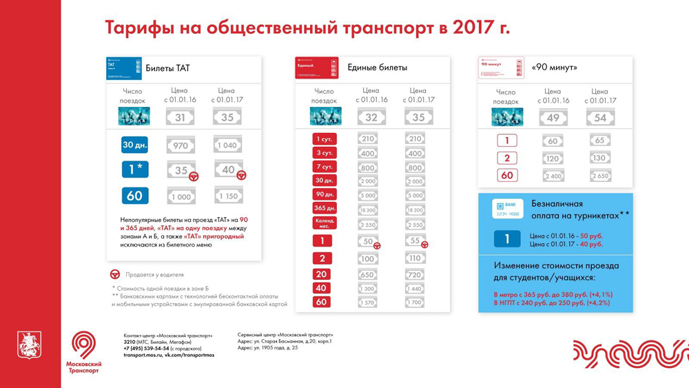 «Из-за увеличения тарифов естественных монополий, роста электроэнергии, стоимости топлива, затрат на приобретение новых комплектующих, стоимости подвижного состава расходы основных городских транспортных предприятий выросли. Перевозчики просили нас повысить тарифы на 15,5 процента. Правительство Москвы окажет предприятиям финансовую поддержку в 2017 году — на это в бюджете на следующий год заложены субсидии в размере 90 миллиардов рублей — и сдержит рост тарифов: на все безлимитные единые билеты тарифы вообще не изменятся, а средний рост составит всего 7,5 процента», — добавила Алина Бисембаева.