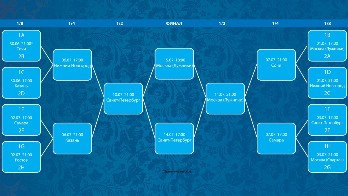 Чемпионат мира-2018. Полный календарь матчей с таблицами и плей-офф.В зале Государственного Кремлевского дворца прошла жеребьевка финального турнира чемпионата мира-2018. Представляем полное расписание игр чемпионата мира по футболу, который стартует 14 июня матчем между сборными России и Саудовской Аравии.Кликабельно! Скачать в формате Pdf можно ЗДЕСЬ. Соперниками сборной России по группе A стали сборные Саудовской Аравии (матч состоится 14 июня на стадионе "Лужники", Москва), Египта (19 июня, "Санкт-Петербург") и Уругвая (25 июня, "Самара Арена"). ГРУППА АМатч №1. 14 июня. 18.00. Москва. "Лужники". РОССИЯ – Саудовская Аравия Матч №2. 15 июня. 15.00. Екатеринбург. Египет – Уругвай Матч №17. 19 июня. 21.00. Санкт-Петербург. РОССИЯ – Египет Матч №18. 20 июня. 18.00. Ростов-на-Дону. Уругвай – Саудовская Аравия Матч №33. 25 июня. 17.00. Самара. Уругвай – РОССИЯ Матч №34. 25 июня. 17.00. Волгоград. Саудовская Аравия – Египет ГРУППА ВМатч №4. 15 июня. 18.00. Санкт-Петербург. Марокко – Иран Матч №3. 15 июня. 21.00. Сочи. Португалия – Испания Матч №19. 20 июня. 15.00. Москва. "Лужники". Португалия – Марокко Матч №20. 20 июня. 21.00. Казань. Иран – Испания Матч №35. 25 июня. 21.00. Саранск. Иран – Португалия Матч №36. 25 июня. 21.00. Калининград. Испания – Марокко ГРУППА CМатч №5. 16 июня. 13.00. Казань. Франция – Австралия Матч №6. 16 июня. 19.00. Саранск. Перу – Дания Матч №22. 21 июня. 15.00. Самара. Дания – Австралия Матч №21. 21 июня. 18.00. Екатеринбург. Франция – Перу Матч №37. 26 июня. 17.00. Москва. "Лужники". Дания – Франция Матч №38. 26 июня. 17.00. Сочи. Австралия – Перу ГРУППА DМатч №7. 16 июня. 16.00. Москва. "Спартак". Аргентина – Исландия Матч №8. 16 июня. 22.00. Калининград. Хорватия – Нигерия Матч №23. 21 июня. 21.00. Нижний Новгород. Аргентина – Хорватия Матч №24. 22 июня. 18.00. Волгоград. Нигерия – Исландия Матч №39. 26 июня. 21.00. Санкт-Петербург. Нигерия – Аргентина Матч №40. 26 июня. 21.00. Ростов-на-Дону. Исландия – Хорватия ГРУППА EМатч №10. 17 июня. 15.00. Самара. Коста-Рика – Сербия Матч №9. 17 июня. 21.00. Ростов-на-Дону. Бразилия – Швейцария Матч №25. 22 июня. 15.00. Санкт-Петербург. Бразилия – Коста-Рика Матч №26. 22 июня. 21.00. Калининград. Сербия – Швейцария Матч №41. 27 июня. 21.00. Москва. "Спартак". Сербия – Бразилия Матч №42. 27 июня. 21.00. Нижний Новгород. Швейцария – Коста-Рика ГРУППА FМатч №11. 17 июня. 18.00. Москва. "Лужники". Германия – Мексика Матч №12. 18 июня. 15.00. Нижний Новгород. Швеция – Корея Матч №28. 23 июня. 18.00. Ростов-на-Дону. Корея – Мексика Матч №27. 23 июня. 21.00. Сочи. Германия – Швеция Матч №43. 27 июня. 17.00. Казань. Корея – Германия Матч №44. 27 июня. 17.00. Екатеринбург. Мексика – Швеция ГРУППА GМатч №13. 18 июня. 18.00. Сочи. Бельгия – Панама Матч №14. 18 июня. 21.00. Волгоград. Тунис – Англия Матч №29. 23 июня. 15.00. Москва. "Спартак". Бельгия – Тунис Матч №30. 24 июня. 15.00. Нижний Новгород. Англия – Панама Матч №45. 28 июня. 21.00. Калининград. Англия – Бельгия Матч №46. 28 июня. 21.00. Саранск. Панама – Тунис ГРУППА HМатч №16. 19 июня. 15.00. Саранск. Колумбия – Япония Матч №15. 19 июня. 18.00. Москва. "Спартак". Польша – Сенегал Матч №32. 24 июня. 18.00. Екатеринбург. Япония – Сенегал Матч №31. 24 июня. 21.00. Казань. Польша – Колумбия Матч №47. 28 июня. 17.00. Волгоград. Япония – Польша Матч №48. 28 июня. 17.00. Самара. Сенегал – Колумбия Календарь матчей плей-офф.Кликабельно! Чемпионат мира-2018. Плей-офф. Фото "СЭ"