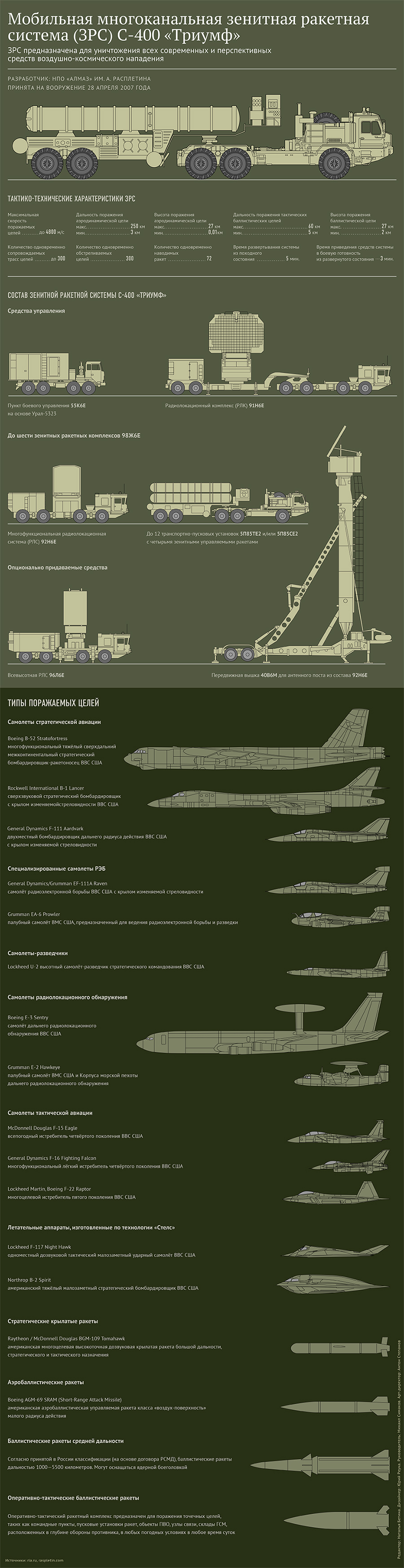 Он описывает С-400 как «одну из самых продвинутых платформ противоракетной обороны», предназначенную в том числе для нанесения ударов по американским самолетам, полагающимся на стелс-технологии.