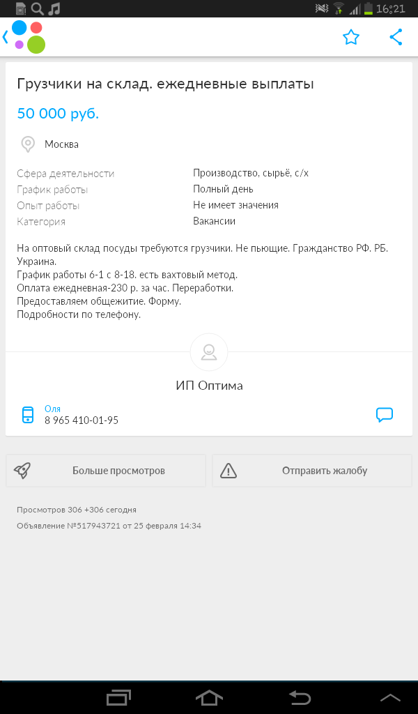 Для работодателей и соискателей. Добрый день! Хочу довести до сведения рекламных агентов и соискателей о нечистоплотности работодателя с номером ID 1776946, КОМПЛЕКТОВЩИК. При предварительном созвоне было сказано, что работа есть с разными графиками и нужно заплатить за форму. На вопрос - будет ли квитанция об оплате формы, был ответ утвердительный. После оплаты был выдан договор, что это агентство, которое оказывает информационные услуги. Когда сын приехал на место работы, ему сказали, что их не интересует, что там сказали в агентстве, сменного графика у них нет, а только вахта 30 -30. Я понимаю, что это полностью наша вина, что были заплачены деньги и не прочитан полностью договор. Просто мы хотим предостеречь других соискателей. Телефон работодателя 89645369535 Дмитрий Владимирович. Договор от ИП Чернова Ю.М. С уважением, Ольга Шульга