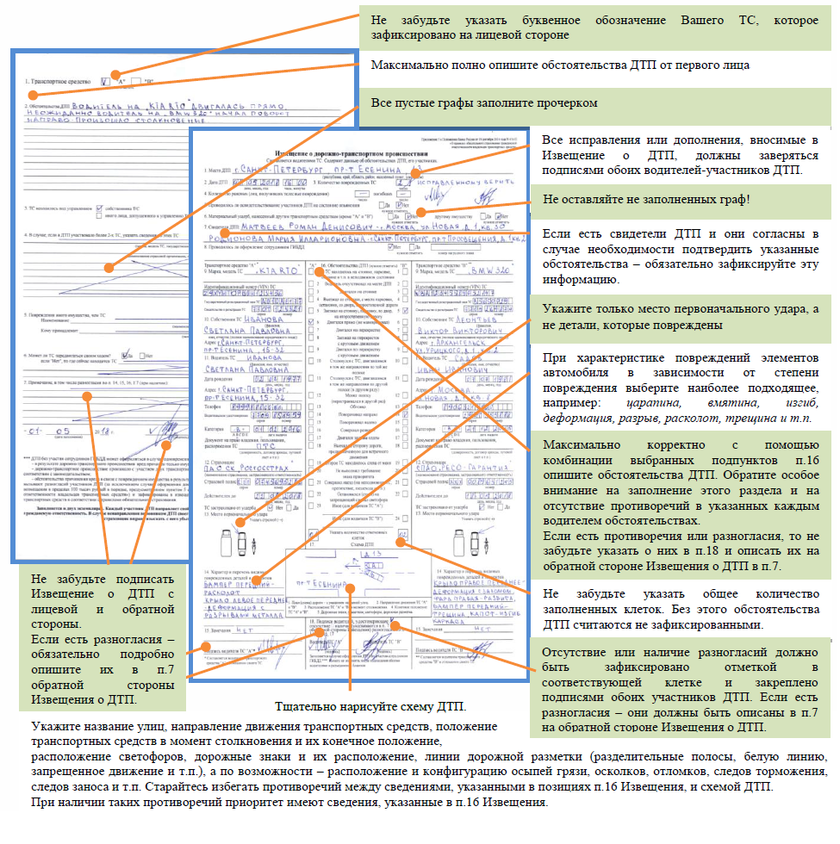 Как оформить аварию без ГИБДД в 2024 году: подробная инструкция.Система «Европротокола» позволяет оформлять аварии без ГИБДД. Рассказываем подробно, как ей пользоваться - с бланками и примерами.1. Когда можно воспользоваться «Европротоколом»?- Эта система работает при небольших авариях – пострадавший в ДТП может получить по «Европротоколу» компенсацию максимум в 50 000 рублей. Правда, есть 4 региона в стране, где можно надеяться на 400 тысяч (это Москва, Подмосковье, Санкт-Петербург и Ленобласть), однако рассчитывать на такую сумму сложно – об этом ниже. То есть если речь идет о небольшой царапине бампера или крыла, то «Европротокол» - отличный вариант. - Нет пострадавших. - Повреждены только автомобили. Только два автомобиля. - У всех есть действующее ОСАГО. - Самое важное – все участники ДТП согласны с тем, кто был прав, а кто виноват, кто обгонял, а кто подрезал. Если есть разногласия – без ГИБДД не обойтись. Итак, еще раз: авария небольшая, никто не пострадал, все согласны, документы в порядке. 2. Авария случилась. Поцарапан бампер. Все согласны на «Европротокол». Что делать?Для начала выставить знак аварийной остановки. Затем настоятельно рекомендуется сделать фото и видео (какие — написано ниже). Если есть свидетели и они готовы предоставить свои телефоны — это будет идеально. Затем нужно правильно заполнить бланки. Каждый водитель делает это самостоятельно, но будьте внимательны — все нюансы аварии у вас должны совпадать. Не забудьте поставить подписи. Далее. Это очень важно. В течение пяти дней нужно отправить извещение в страховую компанию! 3. Какие фотографии надо сделать?- Заполненные и подписанные извещения ДТП. - VIN-номера машин, регистрационные знаки. - Поврежденные детали крупным планом. Каждый элемент – отдельная фотография. Снимать надо детали двух машин. - Поврежденные детали общим планом. Каждый элемент – отдельная фотография. - Общее фото взаимного расположения автомобилей с «привязкой к объектам транспортной инфраструктуры (в кадрах должны быть не только машины, но и дорожные знаки, дома, таблички с указанием номера дома и так далее). 3 разных ракурса. - Фотография автомобиля свидетеля (если есть). 4. Какие подвохи могут быть при заполнении бланка?- Нажимайте сильно на ручку – все, что вы написали, должно отпечататься на копии. Не используйте карандаш. Только ручка. - Надо заполнить все без исключения графы. Если сведения отсутствуют (например, о свидетелях), то ставим прочерк, букву Z или пишем «нет свидетелей». - Особое внимание уделите пункту 14. Должны быть отражены все видимые повреждения. При отсутствии последних возможен отказ в выплате. Напишите слова «возможны скрытые повреждения». Позднее они могут быть выявлены при экспертизе. - Не забудьте про подписи. Они должны быть на всех листках. - Если были исправления, то их должны заверить оба водителя своими подписями. 5. Я виновник аварии. Все подписал. Мне же потом ничего не надо делать?Еще как надо! Пусть по ОСАГО вы не получите компенсации (она положена только пострадавшим), но в страховую вам все равно ехать нужно (ну или, как минимум, отправить в компанию извещение о ДТП). Причем в течение пяти дней. Если этого не сделать, то страховая после выплаты компенсации пострадавшему будет требовать деньги с вас! 6. Как все сложно. А может есть какое-то приложение для телефона?Точно! Наз